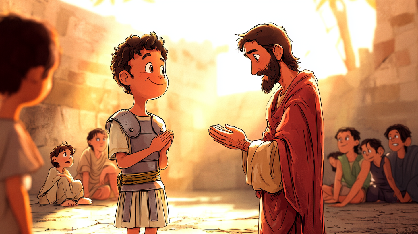In a large village, there were many people who wanted to see Jesus. They wanted to see him, talk to him and ask him for help. Jesus walked through the crowd, and everyone crowded around him. There was a lot of laughter and talking, and it was almost magical to be with him.